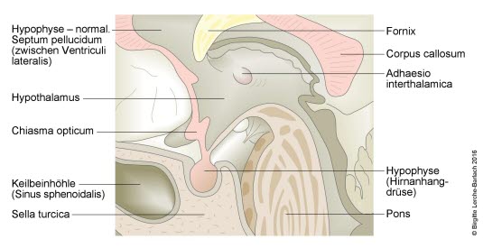 Diabetes insipidus ist eine seltene Stoffwechselkrankheit, die durch ein gesteigertes Durstgefühl und vermehrte Urinproduktion charakterisiert ist. Sie wird verursacht durch einen Mangel an oder fehlende Wirkung von antidiuretischem Hormon (ADH). Dieses Hormon wird in der Hypophyse im Gehirn (siehe Abbildung) produziert. ADH reguliert unter anderem den Wasserhaushalt des Körpers, indem es die über die Nieren ausgeschiedene Flüssigkeitsmenge steuert. Je nach zugrunde liegender Ursache wird die Störung hauptsächlich in zwei Gruppen eingeteilt: neurogener Diabetes insipidus oder nephrogener Diabetes insipidus.