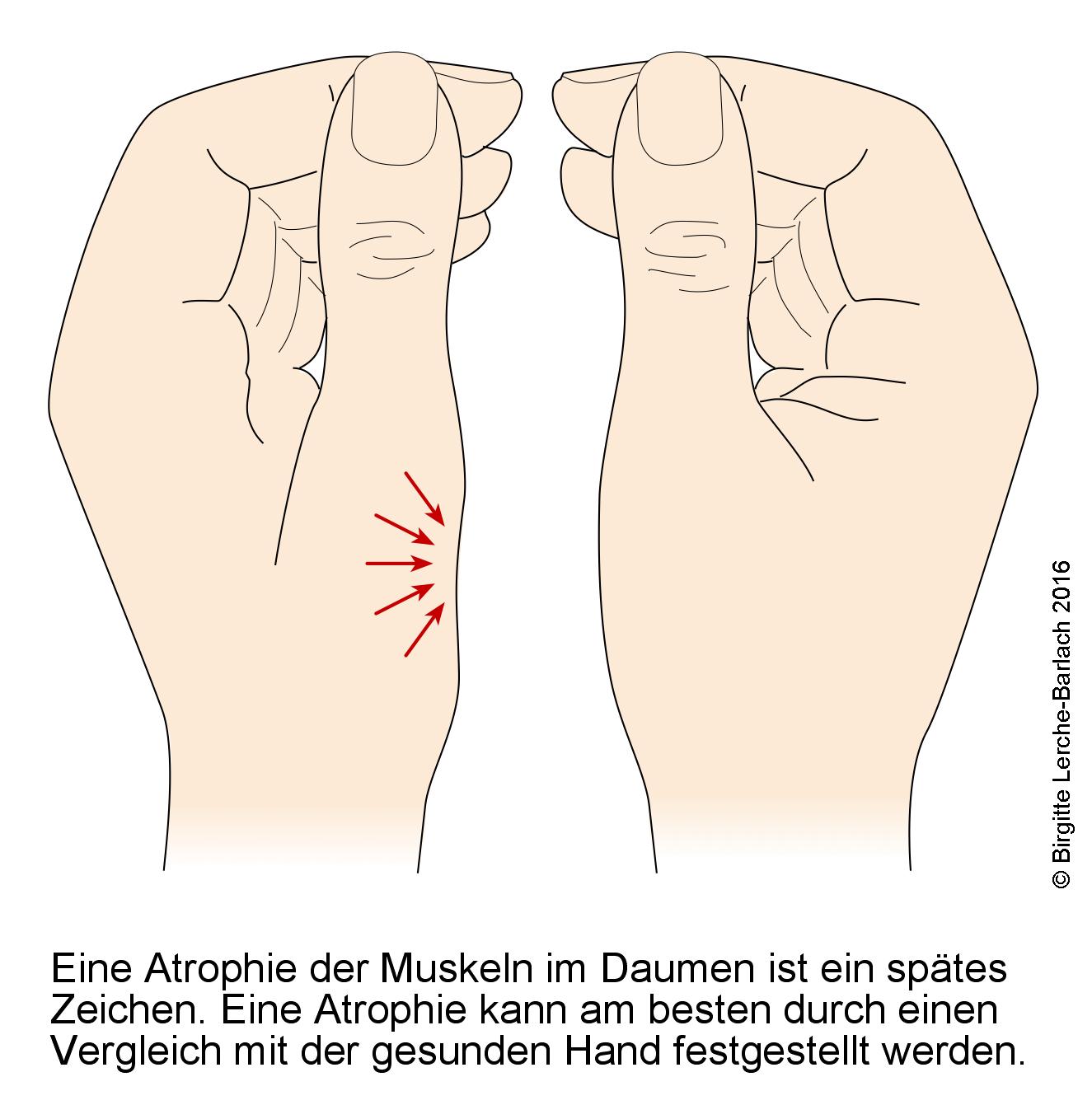 - Symptome:Nächtliches Einschlafen und Missempfindungen der Hände ist ein häufiges Erstsymptom (Brachialgia paraesthetica nocturna) mit Besserung durch Ausschütteln; im Verlauf anhaltende Schmerzen und Sensibilitätsstörungen sowie Kraftminderung und Atrophie des lateralen Daumenballens.