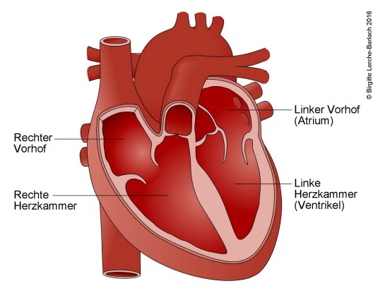 Serce składa się z dwóch przedsionków i dwóch komór. Pozbawiona tlenu krew powracająca do serca najpierw wpływa do prawego przedsionka, a następnie do prawej komory. Z prawej komory krew jest pompowana do płuc, gdzie uwalnia dwutlenek węgla i jest wzbogacana tlenem. Następnie krew gromadzi się w lewym przedsionku i przepływa stamtąd do lewej komory. Stąd krew jest pompowana przez główną tętnicę (aortę) i inne tętnice do krążenia ustrojowego. Pomiędzy przedsionkami i komorami znajdują się zastawki serca, które zapobiegają cofaniu się krwi w niewłaściwym kierunku. Pomiędzy komorami serca a obiegiem płucnym/obiegiem ustrojowym znajdują się również zastawki serca pełniące tę samą funkcję. Serce otoczone jest zewnętrzną powłoką, osierdziem. Na zewnątrz serca znajdują się naczynia krwionośne zwane tętnicami wieńcowymi, które zaopatrują mięsień sercowy w substancje odżywcze i tlen.