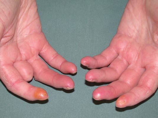 Twardzina układowa, sklerodaktylia, nadżerki i zanik opuszek palców