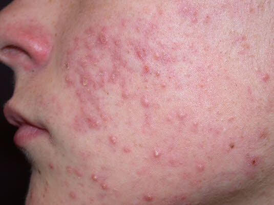- Trądzik grudkowo–krostkowy: z grudkami i krostami (zapalny)